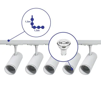 | Fabrikantnaam | Complete L shaped 1-Phase Track Set White incl. 5x Spot fixture + GU10 2700K 3W Dim – 1,5 x 1,5 mete | |